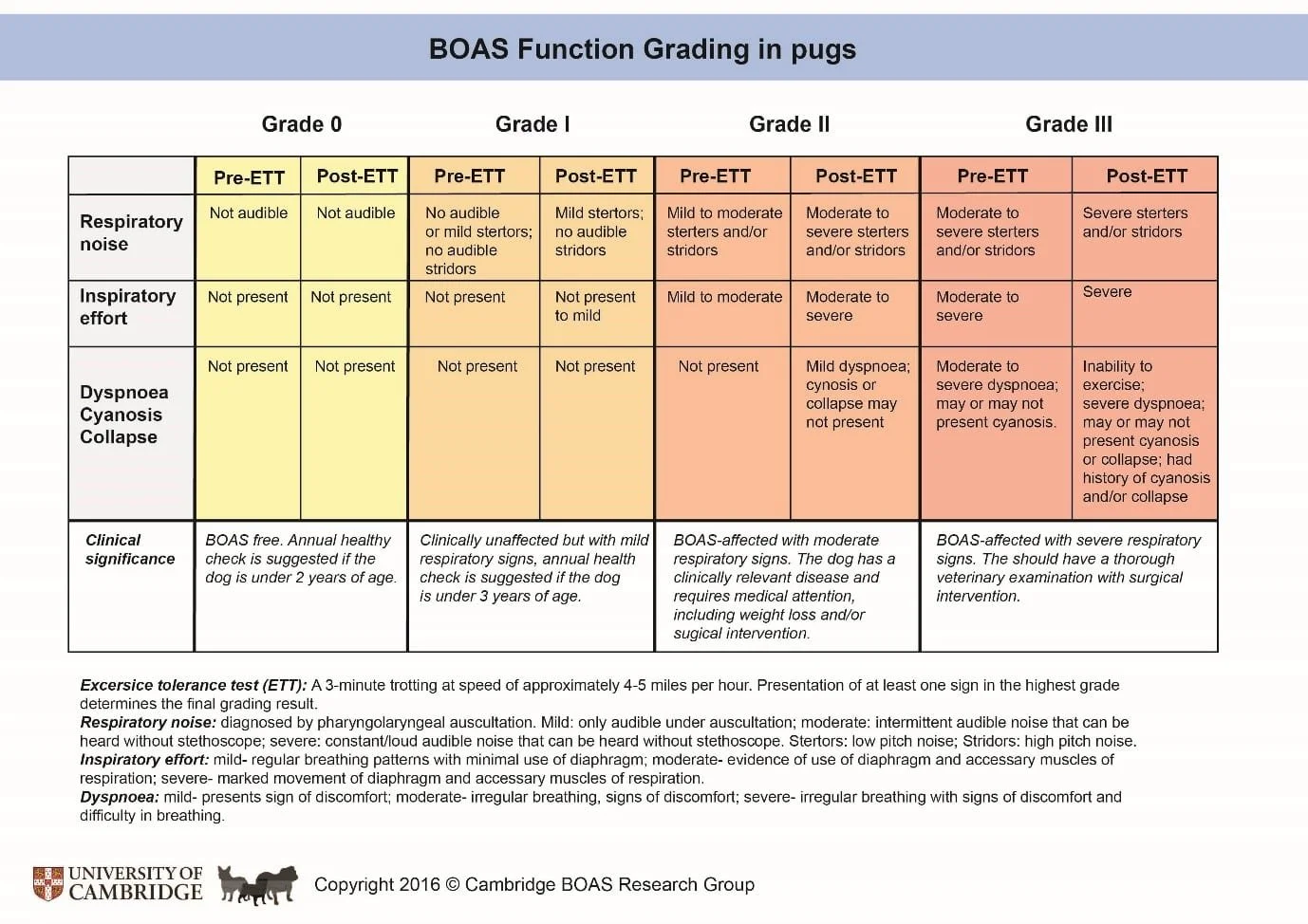 The Kennel Club and University of Cambridge have developed a grading scheme specifically to assess Pugs, along with Bulldogs and French Bulldogs. They will be graded on their nasal roll, nasal stenosis and body condition score, along with an assessment of their respiration.