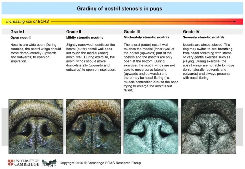 Grading pugs nostrils are graded from 1-4 as pictured. Grade 1 nostrils are of a lower risk of BOAS compared to grade 4.