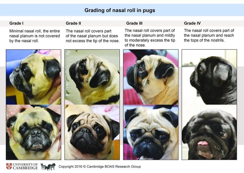 Nasal roll in pugs is used in conjunction with other methods and grading schemes to assess breathing problems known as Brachycephalic Obstructive Airway Syndrome(BOAS).Grading of nasal rolls are graded from 1-4 as Pictured.